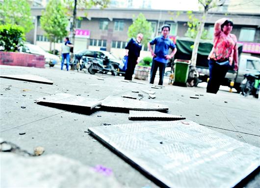 昨日下午,記者趕到設(shè)在該小區(qū)的一個(gè)菜場(chǎng),看到菜場(chǎng)出入口上方,有兩塊邊長(zhǎng)約30厘米的外墻磚脫落,掉落在地,碎成幾塊。破碎的瓷磚旁還有斑斑血跡。