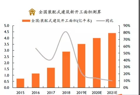 3、未來我國裝配式建筑市場規(guī)??蛇_(dá)萬億元受益國家政策推動,2018年我國裝配式建筑新開工面積達(dá)2.9億平方米,同比增長81%(占新開工面積13.9%),中性預(yù)測下,我們預(yù)計2019~2021年國內(nèi)新開工房屋面積為20.1億平米、19.5億平米、19.1億平米,假設(shè)裝配式建筑占比為17.5%、20.5%、23%,對應(yīng)裝配式建筑新開工面積分別為3.5億平米、4.0億平米和4.4億平米,按每平方米造價2300元計算,2019~2021年我國裝配式建筑市場規(guī)模分別可達(dá)8000億元、9200億元和10000億元(建筑整體建安工程造價,含非裝配式建筑部分)。