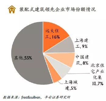 2、從企業(yè)看,國資建筑大佬占據(jù)市場從施工企業(yè)看,由于裝配式建筑并無特殊資質(zhì)要求,具備建筑工程施工總承包資質(zhì)(數(shù)量龐大)的建工企業(yè)均可承接相關(guān)建設(shè)工程,其中中國建筑、上海建工等經(jīng)營市場位于東部發(fā)達(dá)地區(qū)的龍頭企業(yè)優(yōu)先受益。2017年,按PC裝配式建筑構(gòu)件收入計,遠(yuǎn)大住工是中國PC裝配式建筑構(gòu)件市場的最大參與者,市場份額達(dá)到15.9%。市場競爭對手包括大型國有建筑企業(yè)、地方構(gòu)件制造企業(yè)和合資構(gòu)件制造企業(yè)。其他主要參與者包括上海建工、中國建筑、北京住宅產(chǎn)業(yè)化集團(tuán)、上海城建等。